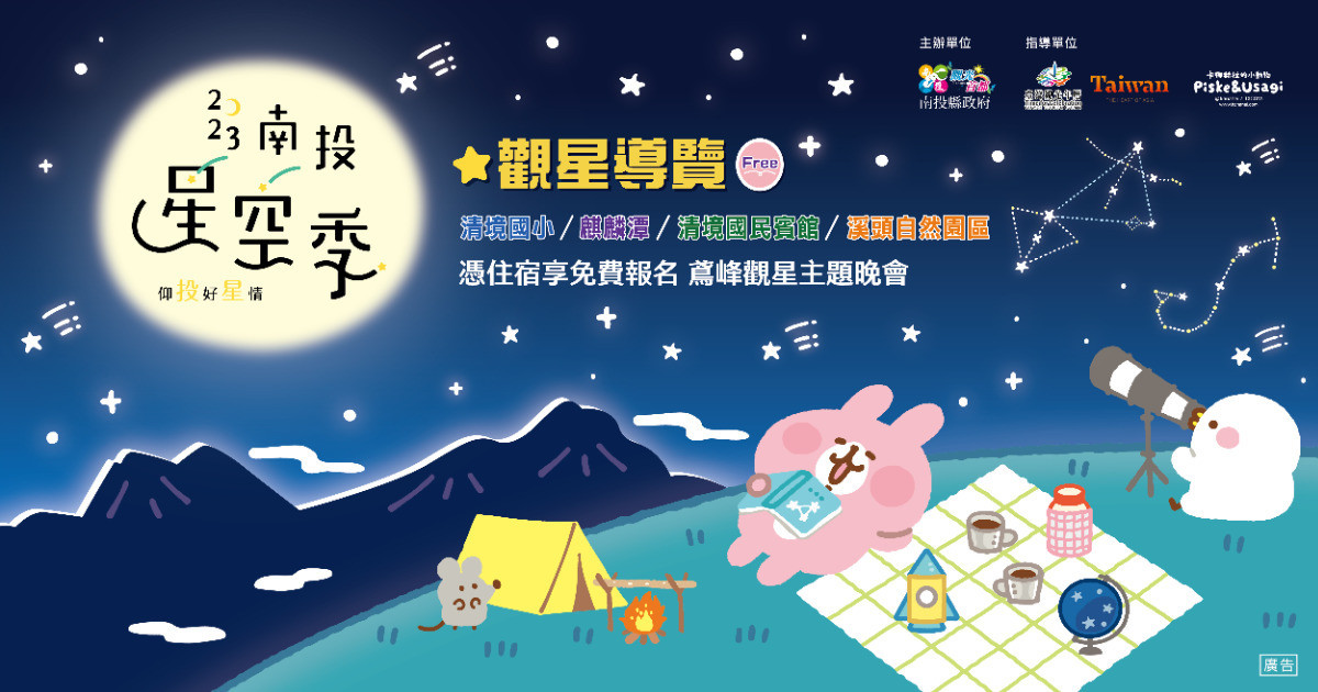 為鼓勵整合南投地區觀星景點熱潮,以及持續推廣南投引以為傲的合歡山國際暗空公園的豐碩觀星資源,挑選四處地點舉辦,並結合星空季主題晚會,凡於該地區住宿之旅客,皆可憑住宿證明於旅宿業者和KKTIX免費報名觀星導覽。